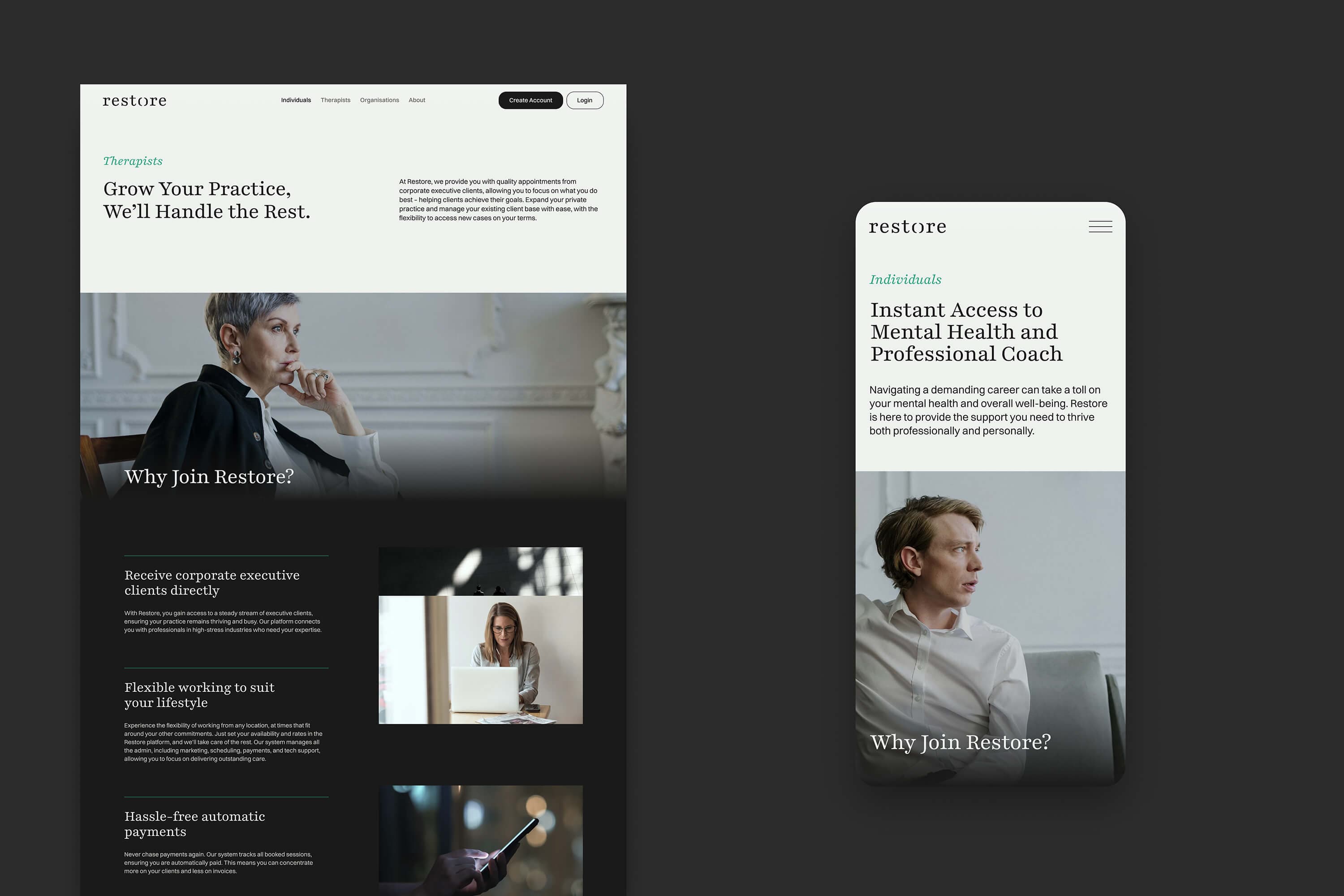 Rather than introducing just another therapy platform, Restore reframes how high-performing individuals understand and integrate mental wellness into their lives. As brand strategists and designers, we set out to reframe support as strength, and position care as a natural extension of leadership.